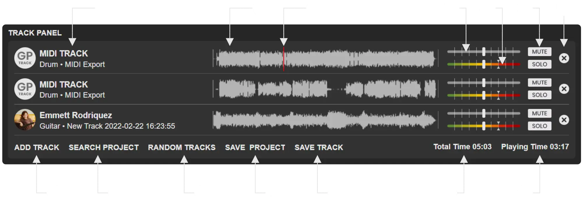 - Shows the tracks recorded by all members, including yours. Click to add the tracks to the TRACK PANEL.