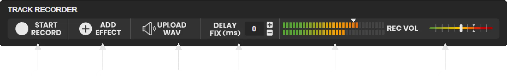 TRACK RECORDER is used to record audio tracks. In addition to your own equipment, you can also use the REC VOL BAR to adjust the volume. However, when inputting, try to adjust the volume of your AUDIO INTERFACE to between 75-85% as indicated by the REC VOL. When you press START RECORD, the recording will start immediately. The score usually reserves 4 beats for you to count down. For more information on recording, please see RECORD TRACKS.