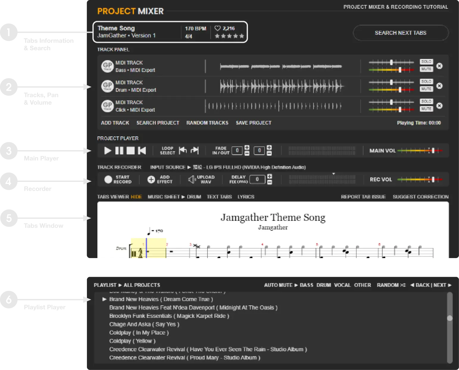 PROJECT MIXER is one of the powerful features on our website, offering a variety of tools. Its primary function is as a multi-user online mixing and recording tool, allowing each member to record audio tracks and blend them with tracks contributed by other members. It also features loop display, track-based loop playback, fade in/out capabilities, and the ability to import Guitar Pro files. Furthermore, it supports custom TXT chord/tabs/lyrics. Additionally, it provides a playlist player for personalized track selection, promising hours of musical enjoyment!